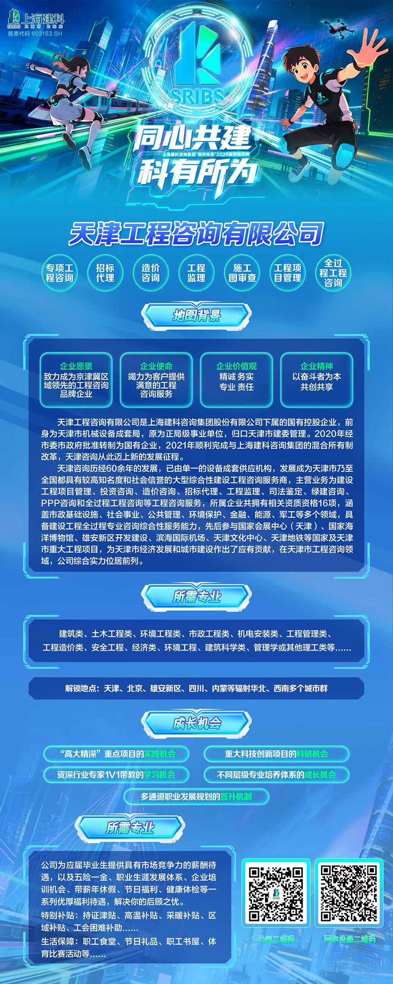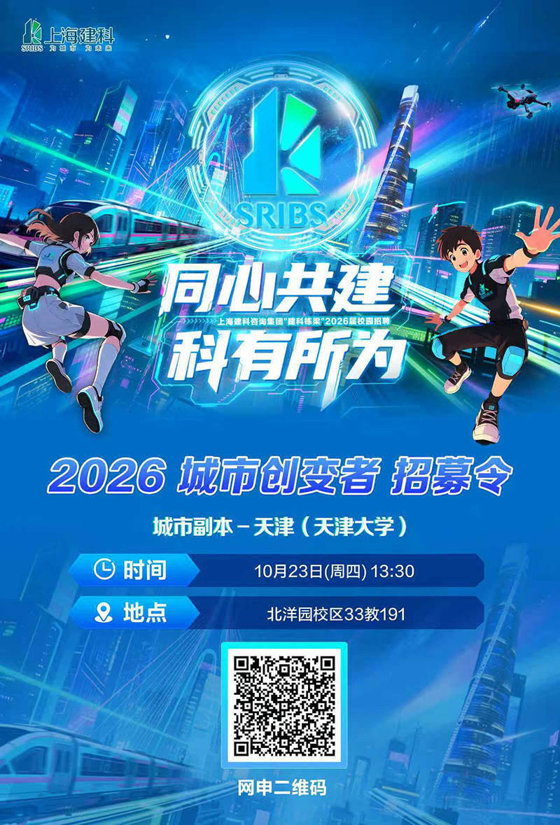 同心共建 科有所為天津工程咨詢有限公司啟動2026屆校園招聘 更新時間:2025-10-22 點擊:115 所屬欄目:公司新聞 誠邀2026屆畢業生參加城市專場宣講會(天津大學) 簡歷投遞方式 郵箱:tec_hr@sribs.com 電話:022-88365660 “我與天津咨詢的相遇” 2026屆校園招聘主題vlog