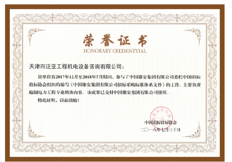 泛亞公司參與編制了雄安集團(tuán)《中國(guó)雄安集團(tuán)招標(biāo)采購(gòu)標(biāo)準(zhǔn)體系文件》,獨(dú)立完成了電力工程專業(yè)模塊的編制工作,為雄安新區(qū)的發(fā)展貢獻(xiàn)泛亞智慧,在雄安新區(qū)展現(xiàn)天津名片,得到各方好評(píng)。